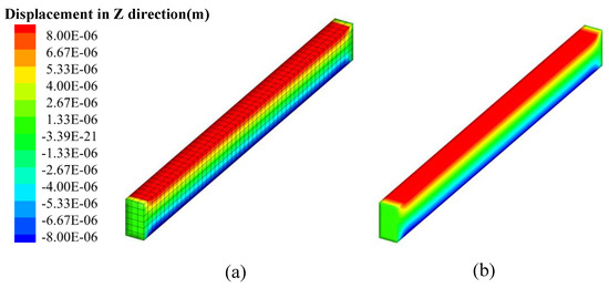 The displacement in the Z direction of the piezoelectric composites computed by (a) Abaqus and (b) TP-EDM.