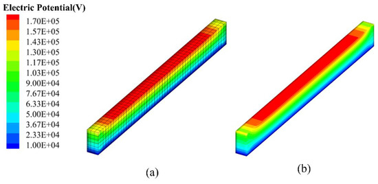 Electrical potential of the clamped piezoelectric 3D beam calculated by (a) Abaqus and (b) TP-EDM.