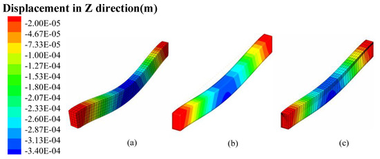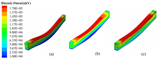 In order to further verify the influence of the mesh generation type on the accuracy of the presented method, a detailed mesh refinement convergence study is performed. Three types of mesh grids are considered, consisting of 900, 5000, and 12,103 brick elements, respectively. In the last one, the irregular mesh grids with different types of hexahedral elements are considered. The deformation and the electrical potential generated by the thermal and mechanical environment can be found in Figure 12 and Figure 13, respectively. It can be found that under the combined coupled loading, the bending deformation will be generated at the clamped piezoelectric beam structure. The electrical potential generated by the mechanical loading will gather at the top surface of the structure.
