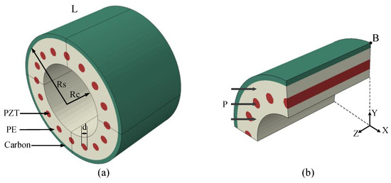 (a) The piezoelectric fiber-reinforced composite cylindrical structure and (b) 1/4 geometry for the simulation.