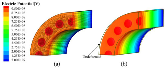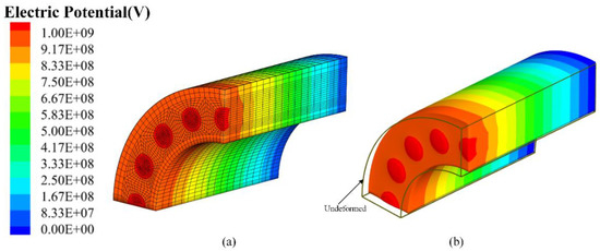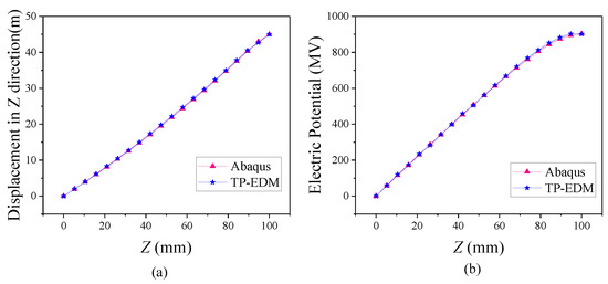 The piezoelectric fiber-reinforced composite cylindrical structure meshes with 23,902 elements. The displacement and electrical potential result of the 1/4 structure calculated by TP-EDM and Abaqus are given in Figure 16 and Figure 17. The displacement and electrical potential data along the line at the position ( are given in Figure 18. It can be seen from Figure 18 that the displacement and potential results curves calculated by TP-EDM are basically consistent as those calculated by Abaqus in the coupling problem of heat conduction and mechanical force. Moreover, the displacement and electrical potential created by Abaqus and TP-EDM of the one point (point B) on the structure are listed in Table 4. It was evident that the results obtained by these two methods are well-matched, although different types of materials are considered.