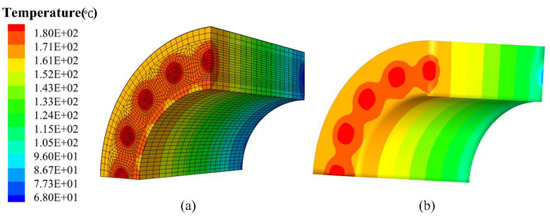 The temperature distribution on the piezoelectric cylinder calculated from (a) Abaqus and (b) TP-EDM.