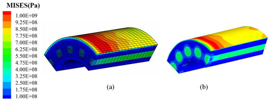 Von Mises pressure of the piezoelectrical cylinder calculated by (a) Abaqus and (b) TP-EDM.