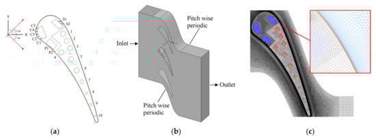 Computational domain and mesh. (a) Vane structure; (b) Computational domain; (c) Mesh.