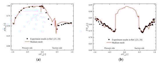 In order to estimate the combined influences of swirls and hot streaks on the cooling performance, steady state simulations by means of conjugate heat transfer (CHT) analyses have been applied with the commercial ANSYS FLUENT 18.2 code. Both the mainstream and cooling flows have been defined as the ideal gas to consider their compressible nature []. Molecular kinetic theory has been applied to model the viscosity, conductivity and specific heat []. In order to accurately predict the boundary layer of laminar flow and the transition state, the transition k-kl-ω turbulence model has been applied to predict the turbulent transition and flow separation. In the fluid domains, the Reynolds averaged continuity, momentum, and the energy equations have been solved. On the basis of Fourier’s law, only the energy equation is solved in the solid domain []. The mesh interface technique with coupled wall have been applied at all interfaces of fluid and solid to ensure the equivalent of temperatures and heat fluxes of the solid domain and fluid domains at the vicinity of interface []. In the present work, the P1 model is adopted to estimate the influence of radiative transfer. To improve computational accuracy, the residual levels of the continuity and energy equations were reduced to levels of 10−3 and 10−6, respectively. In addition, the mass flow error between the inlet and exit is reduced to below 0.1%. To ensure that the numerical results are independent of the mesh strategy, the normalized total pressure and static temperature along the midspan among three meshes are compared in Figure 2. To evaluate the reliability of the solved transport equations and the numerical schemes used in this study, and experimental results of the Case 44,344 [,] is compared to the numerical results in Figure 3. The references total pressure and static temperatures are 285.13 kPa and 701 K, respectively. Overall, the maximum deviations between calculated values of different meshes are smaller than 5%. The medium-mesh with 15.4 million grid elements is selected for hot streak and swirl simulation, as seen in Figure 2. For the normalized total pressure, the predicted data are very close to the experimental results, except for the region between 25% and 50% Cax. For the normalized total temperature, calculated values are also in close agreement with the experimental results, as seen in Figure 3.