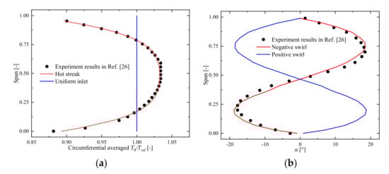 Circumferential averaged temperature and swirl angle profiles []. (a) Temperature profile; (b) Swirl angle profile.