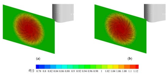 For a typical time-mean temperature field in turbine inlet, the region with peak temperature is located near the midspan, while near the tip and hub of the vane, there are cool regions with lower temperatures. Temperature distortion factors (TDFs) are used to quantify the temperature non-uniformity of hot streaks []. There are several definitions of TDFs in recent studies [,,]. The overall TDF (OTDF) is a measure of the divergence of the hottest gas streak from the mean temperature []. The radial TDF (RTDF) is a measure of the non-uniformity of the circumferentially averaged temperature field []. Local OTDF (LOTDF) and local RTDF (LRTDF) are used to describe the form of the temperature profile. The definitions are as follows: