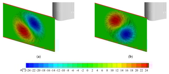 Swirl angle and velocity vectors distribution at the stage inlet plane. (a) Case 3: HS and positive swirl; (b) Case 4: HS and negative swirl.