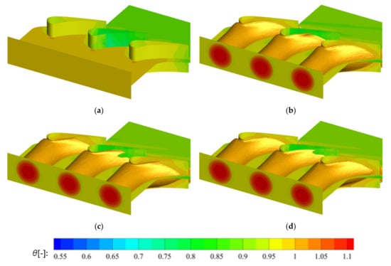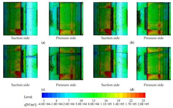 Figure 11 shows the streamline pattern of coolant ejected from film cooling holes located on the leading edge, pressure side and suction side, for different cases. For the uniform inlet case, coolant exhausted from C1 to C3 film rows passes the pressure side downstream, while coolant from the C4 and C5 film rows passes towards the suction side. As it passes through the vane surface, the coolant migrates radically toward the tip region on the pressure side, as seen in Figure 11a. In comparison, the radical migration of coolant is suppressed by the secondary flow channel vortex on the suction side [,]. On the downstream of the pressure side, most of the coolant from the leading edge is pushed to lift off and reattach on the far downstream of the vane surface after it impinges the downstream cooling film. In comparison, homogeneous film coverage can be noted on the suction side. Under the influence of hot streaks, there is no noticeable difference in the streamline pattern of coolant, as seen in Figure 11b. Under the influence of positive swirl, hot flow with negative incidence in the tip region transports the coolant toward the midspan. In the hub region, the radical migration of coolant is also enhanced by the hot flow with positive incidence, especially for the coolant from the leading edge film cooling holes, as seen in Figure 11c. For the hot streak and positive case, film coolant is also transported to the midspan, as seen in Figure 11d. The difference of coolant streamline pattern between two cases is that, relatively larger ejection incidence of film coolant can be observed in the tip region, for the hot streak and positive case. In comparison, larger ejection incidence of film coolant can be observed close to the hub region, for the hot streak and negative case.