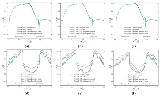 Figure 10 shows the temperature profiles in both the circumferential and radial directions at the plane of stage inlet and −10% Cax. By comparing Figure 10a with Figure 10c, it can be observed that the shape of the NGV passage seems to have a relatively small influence on the local temperature distribution both in the circumferential and radial directions, for the uniform inlet case. Under the influence of hot streaks, there is also a relatively smaller difference in the radial direction, as seen in Figure 10a,b. A local maximum temperature which is about 784 K is located close to the midspan, for both the cutting planes. In the circumferential direction, a much flatter temperature profile is located on the pressure side at −10% Cax plane, as seen in Figure 10d. It is clear that the temperature decreases from 784 K at the stagnation line to 701 K at about −33% pitch length on the pressure side, while this happens at about 30% pitch length on the suction side. Comparing with the hot streak only case, the temperature drops are about 2.8 K, for Case 3 and Case 4, as seen in Figure 10b. In comparison, the temperature increases close to the tip and hub region. Under the influence of positive swirl, there is a clear temperature increment close to the tip region compared with other cases, as seen in Figure 10b. A local maximum can be noticed close to the 55% span which is about 781.7 K, for the hot streak and positive case. In comparison, a negative swirl leads to a hotter hub region, where a local maximum is located close to the 45% span which is about 782.1 K, for the hot streak and negative case, as seen in Figure 10b. In the circumferential direction, flatter temperature profiles are located on the pressure side at −10% Cax plane, as seen in Figure 10d. A local minimum can be noticed close to about 14% pitch length, for Case 3 and Case 4. Considering the significant difference in temperature and velocity vector distribution, the aerodynamics and heat transfer characteristics of NGV under the combined influence of hot streaks, swirls and the shape of the NGV passage should be clearly revealed. Their negative influences should be lessened as much as possible.