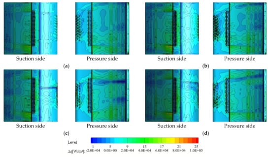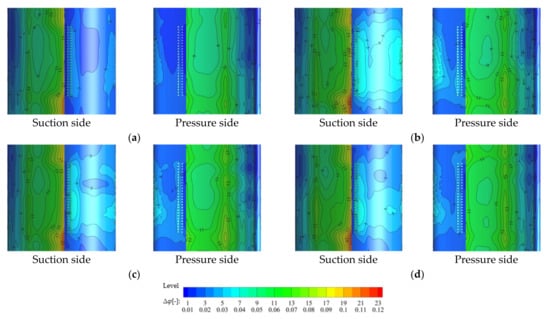 Cooling effectiveness increment distribution of coated vane for different cases. (a) Case 1: uniform inlet; (b) Case 2: HS only; (c) Case 3: HS and positive swirl; (d) Case 4: HS and negative swirl.