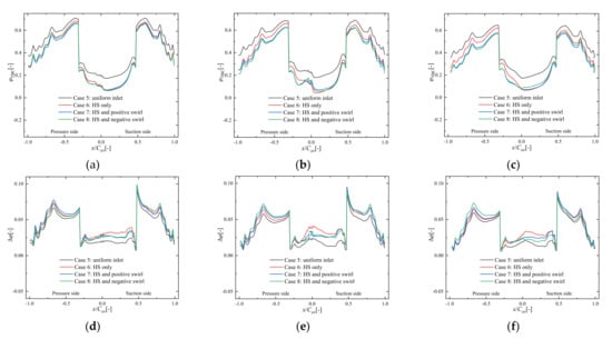Figure 9 shows the temperature and velocity vectors distribution at the cutting plane of −10% Cax, for different cases. The origin of coordinates is located in the stagnation line at the midspan. Under the influence of hot streakd, it is clear the hot streak core is redistributed as it impinged the leading edge, as seen in Figure 9b. Higher temperatured along with shorter circumferential length scales can be observed on the suction side. As expected, swirls change the flow field, and thus stretch the hot flow both in the circumferential and radial directions, as seen in Figure 9c,d. For the hot streak and positive swirl case, the temperature increases close to the tip region on the suction side, and the hub region on the pressure side, as seen in Figure 9c. In addition, a pair of counter-rotating vortices are located near the tip region. Thus, gas with a relatively smaller positive incidence is located close to the hub region. Comparing with the hot streak only case, the temperature increases close to the hub region on the suction side, and close to the tip region on the pressure side, as seen in Figure 9d. Besides, a pair of counter-rotating vortices are located close to the hub region.