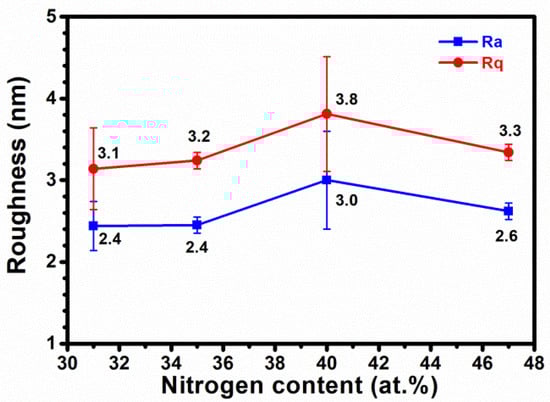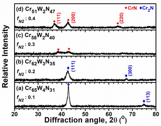 Figure 1 shows the GIXRD patterns of the CrWN coatings. The coatings prepared with an fN2 of 0.1 and 0.2 exhibited a hexagonal Cr2N phase, whereas the coatings prepared with an fN2 of 0.3 and 0.4 displayed a face-centered cubic (fcc) CrN phase. As the formation enthalpy of W2N ( = −72 kJ/mol) is lower than that of CrN (−118 kJ/mol) and Cr2N (−126 kJ/mol) [,], and the W content is low compared to the Cr content, the evolution of the crystalline phase is dominated by the compositions of Cr and N. The phase evolution from Cr2N to CrN was accompanied by a decrease in the atomic ratio of Cr/N from 2.09, to 1.77, 1.47, and 1.08 when the fN2 increased from 0.1, to 0.2, 0.3, and 0.4. Moreover, the reflection Cr2N (111) of the Cr62W3N35 coatings shifted toward a lower value compared to that of the Cr65W4N31 coatings, which implies that higher amounts of N atoms were incorporated into the lattice, resulting in an increase in lattice constants. A similar variation was observed in the reflections CrN (111) and (200) of the Cr51W2N47 coatings compared to those of the Cr58W2N40 coatings.