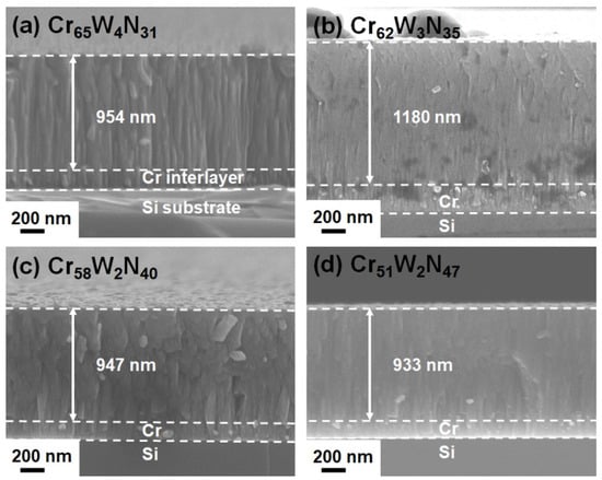 Cross-sectional FE-SEM images of (a) Cr65W4N31, (b) Cr62W3N35, (c) Cr58W2N40, and (d) Cr51W2N47 coatings.
