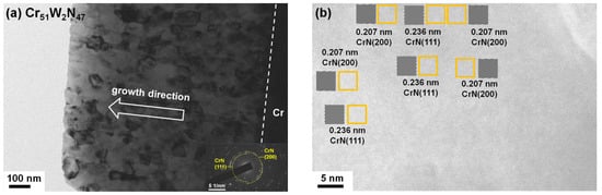 (a) XTEM and (b) HRTEM images of the Cr51W2N47 coatings.