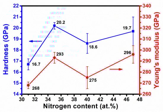 The elemental compositions were analyzed using a field-emission electron probe microanalyzer (FE-EPMA, JXA-8500F, JEOL, Akishima, Japan). The phases were identified through grazing-incident X-ray diffraction (GIXRD) using an X-ray diffractometer (X’Pert PRO MPD, PANalytical, Almelo, the Netherlands). Coating thicknesses were examined via cross-sectional images using a field emission scanning electron microscope (FE-SEM, JSM-6701F, JEOL, Akishima, Japan). The nanostructure was observed using transmission electron microscopy (TEM, JEM-2010F, JEOL, Akishima, Japan). The mechanical properties, hardness (H), and Young’s modulus (E) of the coatings were evaluated using a nanoindentation tester (TI-900 Triboindenter, Hysitron, Minneapolis, MN, USA) and determined using the Oliver and Pharr method []. An atomic force microscope (AFM, DI 3100, Bruker, Santa Barbara, CA, USA) recorded the average roughness (Ra) and root-mean-square roughness (Rq). The residual stress of coatings was estimated using the curvature method [],