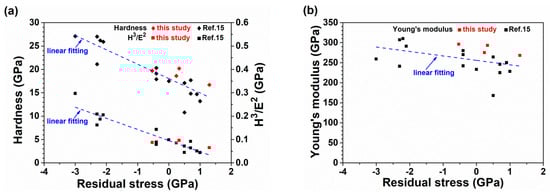 Relationship between (a) hardness and H3/E2 levels and (b) Young’s modulus against residual stresses of the CrWN coatings.