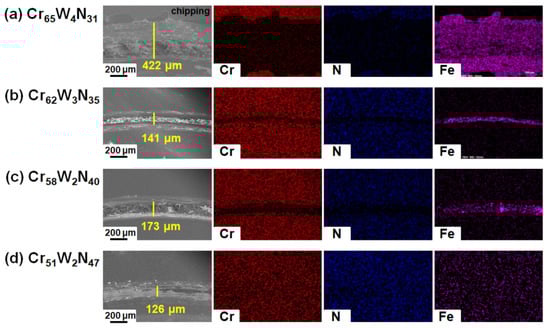 Wear scars and elemental mapping of (a) Cr65W4N31, (b) Cr62W3N35, (c) Cr58W2N40, and (d) Cr51W2N47 coatings.