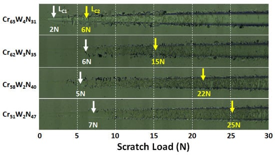 Figure 8 shows the H/E and H3/E2 ratios of the CrWN coatings. H/E represents the indicator of elastic strain to failure [], whereas H3/E2 denotes the resistance against plastic deformation []. The H3/E2 and residual stress exhibited a linear fitting trend (Figure 7a) similar to those of H and H/E (not shown in this paper) against residual stress. H/E and H3/E2 were suggested as pointers for fracture toughness, which affected the wear resistance []. However, such correlations between H/E and H3/E2 for toughness were compatible with hard coatings with low plasticity []. Figure 9 shows the wear scars of the CrWN coatings. Chippings marks were observed along the wear track of the Cr65W4N31 coatings. The elemental mapping of Cr and N indicated that the coating was worn out, whereas the Fe signal revealed the exposure of the SUS420 substrate. Similar wear behavior was shown for the Cr62W3N35 and Cr58W2N40 coatings with narrow wear widths. The results of wear tests indicated that the Cr65W4N31, Cr62W3N35, and Cr58W2N40 coatings were exhausted with a wear length of 200 m, whereas the Cr51W2N47 coatings exhibited a low wear rate of 1.4 × 10−6 mm3·N−1·m−1 with a coefficient of friction of 0.60. The DCMS-prepared CrWN coatings with an H ≤ 19.1 GPa were worn through after wear tests, and the coatings with H values of 20.3–27.0 GPa exhibited wear rates of 3.1–12 × 10−6 mm3·N−1·m−1 []. Figure 10 shows the scratch scars of the CrWN coatings. LC1 and LC2 presented loads inducing cohesive failure and exposing the substrate, respectively []. The Cr65W4N31 coatings exhibited the lowest LC1 and LC2 values among the tested samples, implying their brittleness. Severe chipping was observed for the Cr65W4N31 coatings after the normal load reached the LC1. Slight chipping was found on the Cr62W3N35 and Cr58W2N40 coatings, whereas almost no chipping was detected on the Cr51W2N47 coatings. The distinct deviations in wear and scratch tests could be attributed to the effect of residual stress. The Cr65W4N31 coatings exhibited a high tensile residual stress (1.30 GPa), whereas the Cr51W2N47 coatings demonstrated a compressive residual stress (−0.53 GPa). The LC1 was 2 N for the Cr65W4N31 coatings and 5–7 N for the other three coatings. The LC1 and H/E values of these CrWN coatings exhibited similar trends. The LC2 increased from 6 N for the Cr65W4N31 coatings to 15, 22, and 25 N for the Cr62W3N35, Cr58W2N40, and Cr51W2N47 coatings, respectively, implying that the Cr51W2N47 coatings possessed the highest adhesion strength, agreeing with a high wear resistance. The Cr51W2N47 coating exhibited the superior mechanical properties and tribological characteristics among the surveyed CrWN coatings.