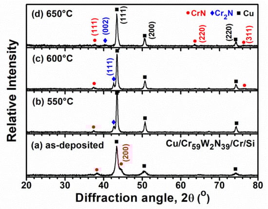 GIXRD patterns of (a) as-deposited and (b–d) annealed Cu/Cr59W2N39/Cr/Si samples.