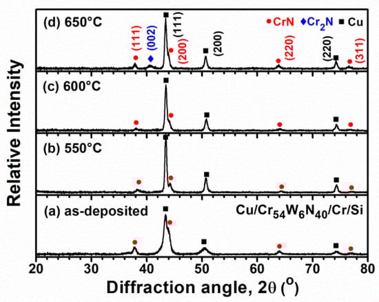 GIXRD patterns of (a) as-deposited and (b–d) annealed Cu/Cr54W6N40/Cr/Si samples.