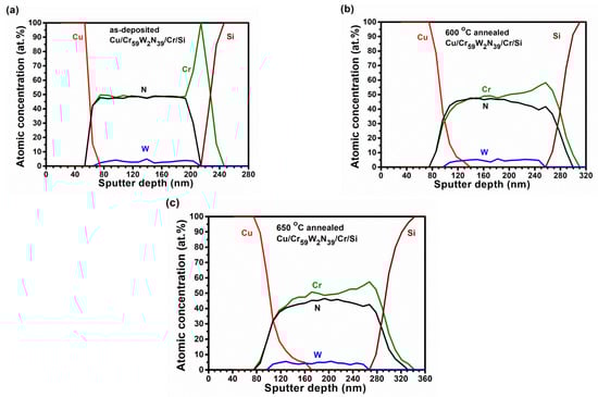 AES depth profiles of (a) as-deposited, (b) 600 °C, and (c) 650 °C annealed Cu/Cr59W2N39/Cr/Si samples. (Annealed in vacuum for 1 h).