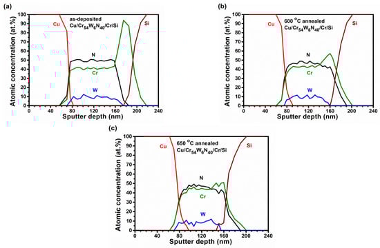 AES depth profiles of (a) as-deposited, (b) 600 °C, and (c) 650 °C annealed Cu/Cr54W6N40/Cr/Si samples. (Annealed in vacuum for 1 h).