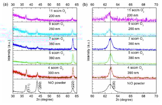 (a) θ–2θ scan diffractograms of NiO thin films (200–390 nm) deposited on glass substrates with different oxygen flow rates. The deposition time was fixed at 6 min. The diffractogram of NiO powder is plotted at the bottom as a reference. (b) Magnified (220) diffraction peaks of NiO.