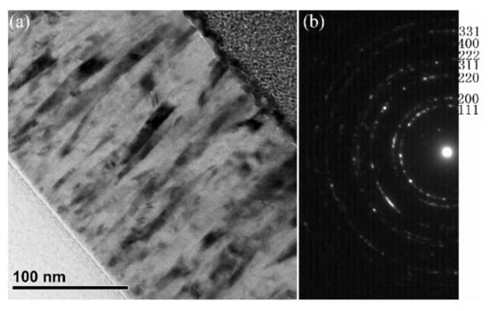 In previous studies, we have shown that the phase structure, preferred orientation, and microstructure of thin films are independent of glass or Si (100) substrates, because the amorphous SiO2 layer on single-crystal Si (100) substrate was not removed [29,30,31]. Thus, the microstructures of NiO thin films grown on Si (100) substrates with various oxygen flow rates (4, 7 and 11 sccm) have been studied by TEM. Here, the bright field TEM image and its corresponding electron diffraction pattern of NiO thin film deposited at 11 sccm O2 is presented in Figure 2. The TEM image demonstrates the columnar microstructure, while the diffraction pattern confirms the single cubic phase structure.