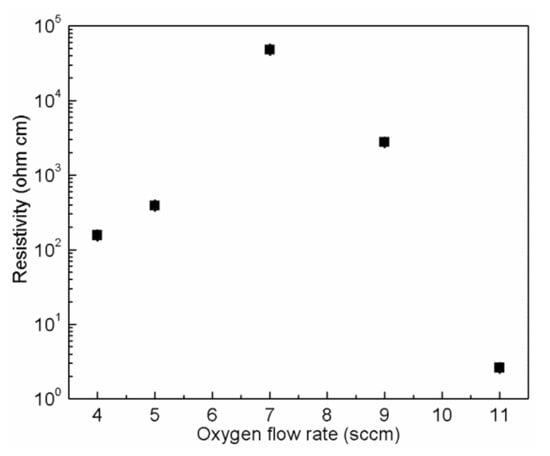 The electrical properties of NiO thin films have been investigated. Figure 3 shows the room temperature resistivity of NiO thin films deposited on glass substrates with various oxygen flow rates (4, 5, 7, 9 and 11 sccm). It was seen that the resistivity of NiO thin films strongly depends on the oxygen flow rate. Increasing the oxygen flow rate from 4 to 7 sccm, the average resistivity increased from 155 to 47,724 Ω cm. Continuing to increase the oxygen flow rate to 11 sccm, the resistivity reduced to 2.6 Ω cm. Once the oxygen flow rate exceeded 11 sccm, the deposition rate was extremely low. In addition, Seebeck coefficients of NiO thin films grown with 4, 7 and 11 sccm O2 have also been checked. In the case of thin films deposited with 4 and 11 sccm O2, the Seebeck coefficients were 334 and 277 V/K, indicating their p-type conduction. However, the Seebeck coefficient of NiO thin film grown with 7 sccm O2 could not be determined precisely, probably due to its relatively high resistance.