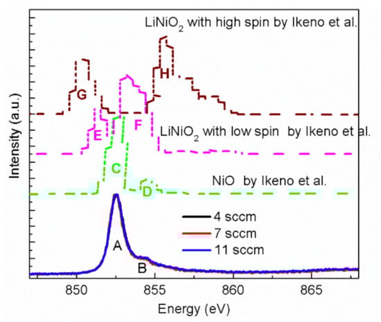 Furthermore, energy loss near edge structure (ELNES) spectra of NiO thin films with discrepant resistivity and compositions have been studied. Figure 4 shows the ELNES spectra of Ni L3 edges attained from our NiO thin films grown with 4, 7 and 11 sccm O2, as well as the theoretical spectra of NiO and LiNiO2 calculated by Ikeno et al. [32]. Examining the experimental spectra in Figure 4, two peaks are clearly visible in the Ni L3 ELNES, labeled as A (852.5 eV) and B (854.4 eV). Traditional hypotheses assume that peak B would correspond to Ni3+ species, and the change in resistivity is explained by the variation of relative integral intensity between peak A and B [22,33,34]. Referring to this hypothesis, NiO thin films with low resistivity (4 or 11 sccm oxygen flow rate) in this work should possess much more Ni3+. Thus, a stronger intensity of peak B is expected. However, such an assumption is contrary to our experimental results. As seen in Figure 4, Ni L3 ELNES spectra of NiO thin films with different resistivity exhibit almost the same features, which seems to indicate that the multipeaks in Ni L3 are the intrinsic characters. This agrees well with the report by Peck et al., that a small change exists in the XAS spectra of bulk and nanoscaled NiO prepared by different methods [35]. Similarly, the Ni 2p3/2 XPS spectra of these thin films also exhibited little difference with each other (see Figure S4 in the supplementary information).
