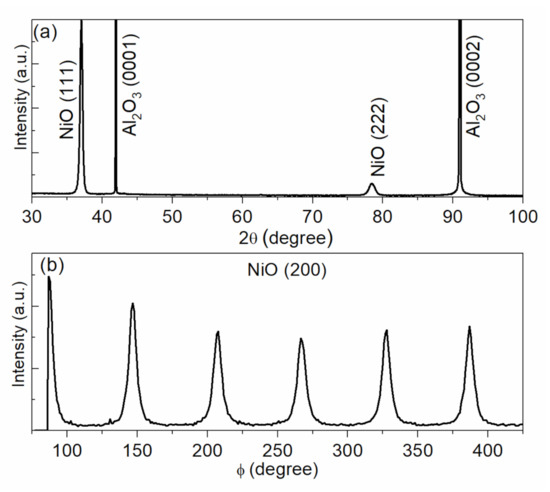 (a) θ–2θ scan diffractograms of NiO thin films (about 200 nm thick) deposited on Al2O3 (0001) substrates with 11 sccm oxygen flow; (b) θ–2θ scan diffractogram of the (200) plane.
