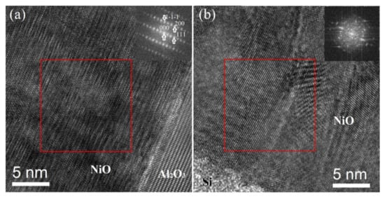 HRTEM images of an epitaxial NiO thin film on Al2O3 substrate (a) and polycrystalline thin film on Si substrate (b). These films were deposited at the same time. Insets show the FFT patterns of selected regions marked by red frames.