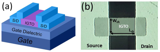 (a) Schematic view and (b) optical image of the fabricated IGTO TFTs prepared to examine the effects of varying oxygen content on the electrical characteristics of TFTs during channel layer deposition.