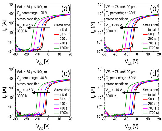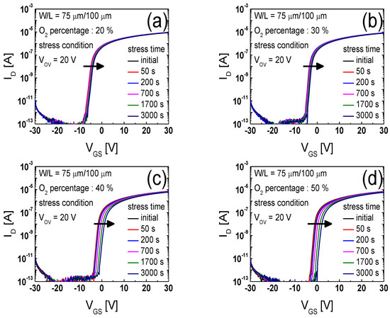 Figure 3a–d show the time evolutions of the transfer curves under a constant overdrive voltage (VOV = VGS − VTH) of 20 V measured from the IGTO TFTs prepared at the different oxygen contents of 20%, 30%, 40%, and 50% in the sputtering ambient, respectively. As can be seen in Figure 3a–d, the transfer curves shifted in the positive direction with an increase in the stress time in all the TFTs.