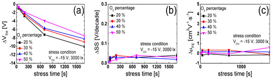 Furthermore, Figure 4a–c illustrate the time dependence of the threshold voltage shift (ΔVTH) and that of the variation in the SS (ΔSS) and μFE (ΔμFE) values obtained from the IGTO TFTs prepared at different oxygen percentages in PBS after every stress time. Figure 4a shows that ΔVTH in the IGTO TFTs prepared at 40% (ΔVTH = 2.78 V after 3000 s) and 50% (ΔVTH = 3.19 V after 3000 s) oxygen exhibited significantly larger values than those in the IGTO TFTs prepared at oxygen contents of 20% (ΔVTH = 0.98 V after 3000 s) and 30% (ΔVTH = 1.00 V after 3000 s).