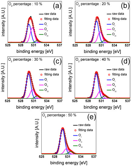 To evaluate the physical mechanisms for the effects of varying oxygen content on the electrical properties and stabilities of the IGTO TFTs, as observed in Figure 2, Figure 3, Figure 4, Figure 5 and Figure 6, the IGTO thin films prepared at different oxygen percentages were analyzed via XPS. Figure 7a–e show the O 1s core-level XPS results of the IGTO thin films prepared at the different oxygen percentages of 10%, 20%, 30%, 40%, and 50%, respectively. The O 1s XPS results were deconvoluted into three peaks (OI, OII, and OIII) using the Gaussian function, where their origins are the lattice oxygen (OI), VO (OII), and the weakly bonded excess oxygen or the hydroxyl group (OIII), respectively. The positions of each peak are 529.8 ± 0.1 (peak OI), 530.7 ± 0.1 (peak OII), and 531.8 ± 0.1 (peak OIII) eV [14]. Figure 8 shows the XPS peak area ratios corresponding to OI, OII, and OIII, obtained from the IGTO thin films prepared at different oxygen contents in the sputtering ambient. Figure 8 shows that the XPS peak area ratio of OIII continuously increased with an increase in the oxygen percentage, implying that the higher area ratio of OIII in the IGTO thin films prepared at higher oxygen percentages is probably due to the larger number of weakly bonded excess oxygen atoms within the IGTO thin films [33,34]. In IGZO or IGTO, the weakly bonded excess oxygen is easily ionized to the oxygen interstitials (Ois) owing to the low formation energy, where Oi creates acceptor-like sub-gap states near the conduction band (CB) edge [35,36,37]. The acceptor-like sub-gap states above the mid-gap increase SS, enhance electron trapping and the μFE remains unchanged during PBS in n-type oxide TFTs. Therefore, the high SS, and poor PBS stability of the IGTO TFTs prepared at 40% and 50% oxygen can be ascribed to the relatively high concentrations of Oi within the IGTO channel layer. Furthermore, the formation of Oi from the weakly bonded excess oxygen is accelerated under PBS in IGZO or IGTO TFTs, which is believed to be the reason for the increase in the SS values after PBS in IGTO TFTs prepared at 40% and 50% ambient oxygen. In addition, Figure 8 shows that the XPS peak area ratio of OII continuously decreased as the oxygen percentage increased. It is well known that VO creates shallow and deep donor states within n-type oxide semiconductors, such as IGZO or IGTO [38,39]. The ionized shallow donors provide free electrons to the CB; therefore, the concentration of free electrons increases as the concentration of VO increases within the IGTO. The increase in the free electron concentration facilitates the formation of a percolation conduction path in multi-cation n-type oxide semiconductors. Therefore, the low value of VTH and the high values of μFE obtained as the oxygen percentage decreased [40,41]. Therefore, a higher μFE value and lower VTH value of the IGTO TFTs prepared at lower oxygen percentages can be attributed to the higher concentrations of VO within the IGTO active layer.