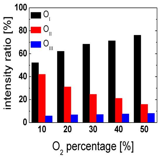 XPS peak area ratios corresponding to OI, OII, and OIII, obtained from the IGTO thin films prepared at different oxygen percentages in the sputtering ambient.