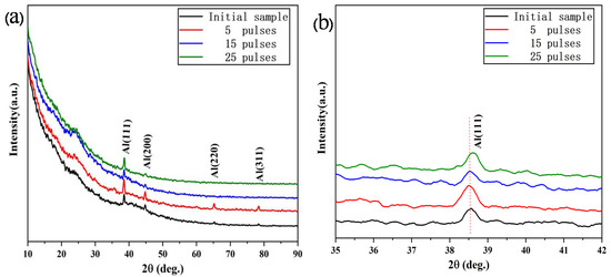 Figure 1 shows the Grazing Incidence X-ray Diffraction (GIXRD) patterns of Al-20SiC-0.3CeO2 composite samples before and after electron beam treatment. Figure 1a shows that, compared with the original sample, no new diffraction peaks are observed after high-current pulsed electron beam treatment, indicating that the sample with CeO2 has no phase change before and after electron beam treatment. Note that the CeO2 phase is not detected in the GIXRD pattern. This is primarily because the low rare earth content on the alloy surface does not reach the detection limit of the GIXRD instrument. To accurately measure the intensity of diffraction peaks, this study uses grazing incidence X-ray technology to measure Al diffraction peaks. Because of the small incidence angle of X-rays, the area of interaction between X-rays and the material is large, which improves the sensitivity of X-rays to the detection of surface information, and avoids strong signals from the substrate; furthermore, the intensity of diffraction peaks for the electron beams in the modified layer can be accurately measured. The GIXRD image in Figure 1a shows that as the number of pulses increases, the intensity of all Al diffraction peaks first increases and then decreases. The intensity of the Al diffraction peaks is strongest at the fifth pulse. The Al(220) and Al(311) diffraction peaks disappeared after 15 pulses, indicating that the high-current pulsed electron beam treatment changed the crystal orientation of the surface of the sample, and the Al grains were preferentially aligned along with the Al(111) and Al(200) crystal planes. The growth tendency is enhanced. The change of orientation of the material induced by the electron beam can be attributed to the following reasons. First, the rapid solidification process induced by the electron beam can change the crystal orientation. In fact, the precipitated phases generated after the nucleation of the surface-melting zone during the cooling process will grow along a specific crystal direction as the temperature gradient changes. Lonardelli [26] used neutron diffraction to study Ti alloys, where β-phase grains precipitated after melting in the surface region of the alloy grow along the gradient direction of temperature (perpendicular to the irradiation direction) and subsequently generate the α’martensite of specific orientation by the metastable selection. Second, the thermal stress generated by the rapid cooling process changes crystal orientation. Zou treated AISI 316L stainless steel surface with a high-current pulsed electron beam and discovered that severe plastic deformation occurred in the surface layer, and mechanical twins were activated in the crystal grains, which grew along the <1 1 1> direction close to the normal line of the sample [27]. Hao et al. treated AISI 316L stainless steel with a high-current pulsed electron beam and discovered that because of the plastic deformation during the modification process, the Al(111) crystal plane became the preferred direction of modification [28]. However, in this experiment, because no new phase is generated, the assumption that the phase transition changes crystal orientation is ruled out.