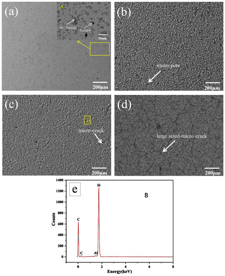 Figure 2 shows the surface micro-structure of the Al-20SiC composite before and after HCPEB treatment. Figure 2a(A) in the upper right corner is a magnified view of the yellow area in Figure 2a. Figure 2a(A) shows that the grey silicon carbide phase in the original structure is evenly distributed in the Al matrix, and the size of the SiC particles is ~10 μm. A certain amount of pore structure can be observed close to the SiC particles. The formation of this structure is attributed to the relatively high viscosity of liquid Al at a lower sintering temperature of 590 °C, which causes a poor flow of the Al liquid, which will make the material unable to complete the replenishment of the molten aluminum during the solidification process. Thus, the material shrinks to form a pore structure. After the electron beam treatment, the large-sized pores on the sample surface are reduced because of the filling of Al liquid; however, there are many micro-pores, as shown in Figure 2b–d. After the electron beam is irradiated, the surface of the sample is rapidly cooled at a rate of up to 108 K/S. The intense surface tension generated during the cooling process will cause the molten surface to rapidly shrink and form micro-pores. Compared with the original sample (see Figure 2a), the size of the micro-pores produced by the electron beam treatment is greatly reduced, particularly when the surface is irradiated with 15 and 25 pulses, and fewer micro-pores are observed on the surface. Because the continuously increasing energy provides a sufficient duration for the molten state after multiple irradiations, the previously generated micro-pores are refilled by the flowing liquid [35]. Moreover, Figure 2c shows that there are additional micro-cracks on the surface after 15 pulse treatments, because the energy of the electron beam is converted into heat when it irradiates the surface.