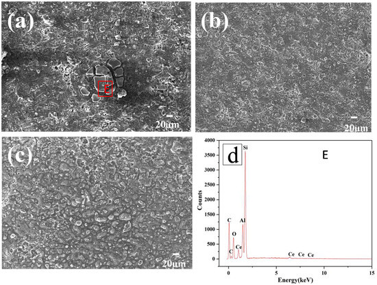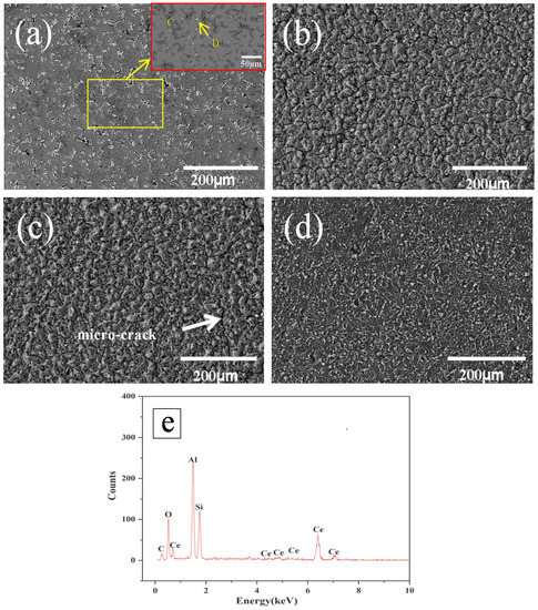This is primarily because the addition of CeO2 can significantly improve the wettability between the liquid-phase Al and solid-phase SiC, and therefore, relatively dense samples can be obtained. The white phase indicated by the point in Figure 3a was analyzed by SEM-EDS and indicated by the D point, which was found to be a Ce-rich intermetallic compound by SEM-EDS; the corresponding EDS results are shown in Figure 3e. Compared to the specimens without the addition of CeO2 (see Figure 2c,d), the surface micro-cracking was significantly reduced after the electron beam treatment, as shown in Figure 3c,d. The above phenomenon indicates that the addition of the rare-earth oxide CeO2 significantly improved the surface micro-cracking of the alloy. Based on a related study [36], rare-earth elements and their rare-earth oxides can eliminate micro-cracks generated in a molten cladding layer. The following is a detailed description of the mechanism of rare earth’s elimination of micro-cracks: CeO2 reacts with impurities in the re-melted layer of the high-current pulsed electron beam, weakening the local stress concentration of the brittle phase molten pool and reducing the sensitivity of micro-cracks, and thus suppresses the growth of micro-cracks and even eliminates them. Simultaneously, the surface tension is reduced such that the contact angle between Al and SiC becomes smaller, which aids in the elimination of pores. Besides, the addition of CeO2 helps to reduce the solid-liquid interface energy, improve the wettability of liquid aluminum and SiC, improve the bonding force of the metallurgical interface, reduce the probability of micro-cracks, and significantly improve the surface micro-structure.