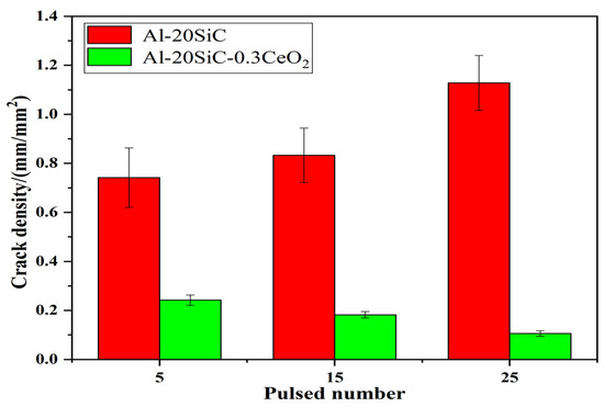 The degree of surface micro-cracks (crack density) after HCPEB treatment is characterized through the measurement and calculation of crack length per unit area. Figure 4 shows the relationship between the micro-crack density and number of pulses. With an increase in the number of pulses, the crack density of samples with rare earth CeO2 and without rare earth CeO2 present an opposite trend. For the Ce-containing samples treated by HCPEB, the crack density decreased from 0.242 mm/mm2 for five pulses to 0.106 mm/mm2 for 25 pulses, indicating that the stress concentration decreases as the number of pulses increases. However, the crack density increase from 0.742 mm/mm2 for five pulses to 1.128 mm/mm2 for 25 pulses, indicating that the stress concentration increased with the number of pulses. Indeed, the change in the micro-cracks corresponds to the results in Figure 2; Figure 3, indicating that Ce reduces the stress concentration, reducing or even eliminating micro-cracks. The mechanism of rare earth’s elimination of micro-cracks caused by HCPEB treatment is summarized as follows: the presence of Ce significantly improves the surface micro-structure; at the same time, the stress concentration is reduced under the same pulse number; and finally, the micro-cracks are reduced.
