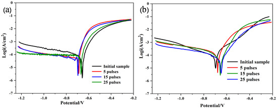 Combining the above-mentioned analysis, the Al(111) and Al(200) crystal face preferential growth in this study is attributed to the rapid solidification effect induced by the electron beam and plastic deformation induced by the thermal stress generated during the electron beam treatment. Moreover, the Al(111) surface is close-packed. The surface has the smallest surface energy and good stability, which is conducive to improving the microstructure and performance [29]. In addition, Figure 1b (the magnified view of Figure 1a) shows that after 25 pulses, the diffraction peak shifts to a high angle, which is attributed to residual compressive stress in the modified layer. The residual compressive stress on the alloy surface reduces interplanar spacing and causes lattice distortion [30,31]. The effect of compressive stress is primarily attributed to the shift of the diffraction peaks to high angles. This phenomenon has been reported in the Al-Si alloy and nickel alloy systems [32,33]. Residual compressive stress contributes to improved corrosion resistance, which is confirmed in the following analysis of results. Increasing the residual compressive stress prevents Cl−1 penetration, while crack initiation is suppressed to an extent, and corrosion resistance is enhanced [34].