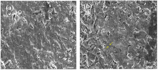 Figure 6 shows the corrosion morphology of the Al-20SiC composite material after being irradiated with a high-current pulsed electron beam without the addition of rare-earth elements. The figure shows that the brittle phase has exposed many grain boundaries of SiC particles after electrochemical corrosion, indicating that the grain boundaries of SiC particles have been corroded. Because of the elemental diffusion effect induced by the electron beam, Al will penetrate the brittle phase. Because the atoms at the grain boundaries deviate from the equilibrium position and have higher kinetic energy, there are additional defects such as holes, impurity atoms, and dislocations at the grain boundaries. Note that the Al atoms will diffuse along the grain boundaries of SiC particles rather than spreading to the inside. Next, the Al phase at the grain boundary corrodes under the corrosion of the NaCl solution, forming typical intergranular corrosion. Moreover, micro-cracks (yellow arrows) are reported within the grains, indicating that crack sources are formed in the grain boundaries. Because of the difference in chemical composition between the grain boundaries and grains, internal stress will be caused. Under the action of internal stress, micro-cracks propagate from the crack source at the grain boundary to the inside of the grain, resulting in the coexistence of intergranular corrosion and cracks. Based on the above analysis, the brittle phase has undergone intergranular corrosion, and the corroded material is the Al phase. This defect leads to the deterioration of corrosion resistance. The following factors are attributed to combining the corrosion morphology to explore the corrosion mechanism: After electron beam treatment, a large number of micro-cracks will appear on the surface of the alloy, allowing the NaCl solution to easily penetrate the micro-cracks and accelerate the corrosion process. There are few undissolved O2− ions in the micro-cracks; however, Cl− ions tend to be concentrated, which causes the metal to change from a passivated state to an activated state, and results in relatively low corrosion resistance of the alloy [37]. Moreover, the brittle phase will form a small-sized micro-porous structure after the electron beam treatment, and the alloy surface is subjected to residual stress. Consequently, micro-pores are easily used as corrosion initiation points, leading to the occurrence of pitting and stress corrosion. Therefore, the existence of the two structures is not conducive to surface corrosion resistance.