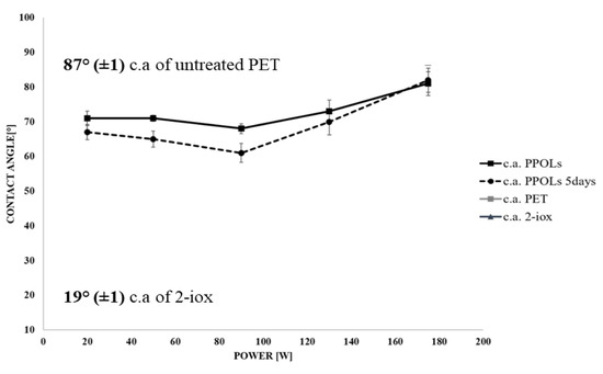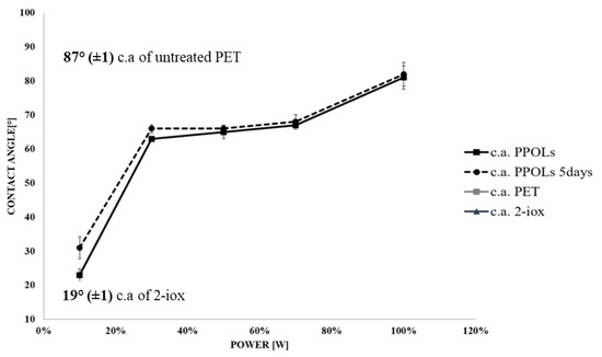 c.a. in the continuous regime at different powers; the values were measured on PET sheets. The values of the contact angle are the average of 5 values collected for each sample.