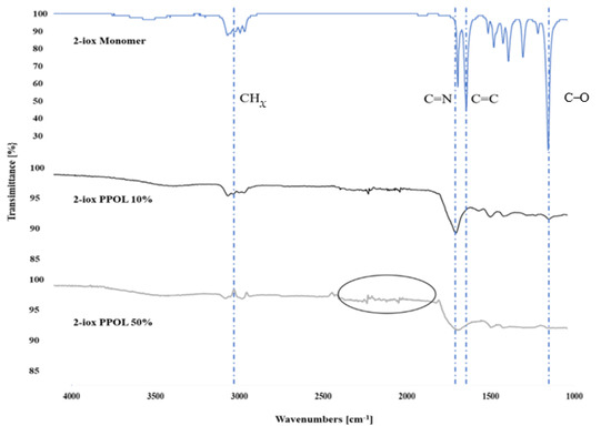 ATR-FTIR spectra of the 2-iox, 10% PPOL and 50% PPOL. The peak at 3000 cm−1 is relative to CHx; at 1662 cm−1, the C=N peak is identifiable; at 1630 cm−1, the signal is relative to the C=C; and at 1182 cm−1, the peak of C–O is identifiable.