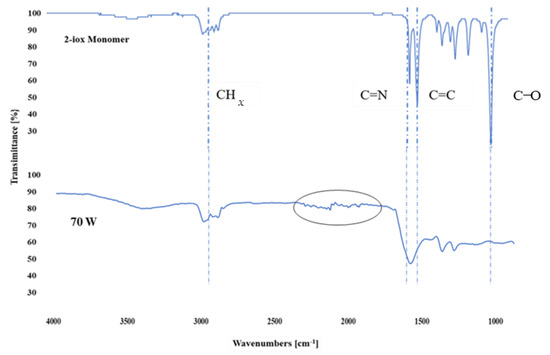 ATR-FTIR spectra of the monomer and 70 W PPOL. The peak at 3000 cm−1 is relative to CHx; at 1662 cm−1, the C=N peak is identifiable; at 1630 cm−1, the signal is relative to the C=C. The peak of C–O is no longer identifiable.