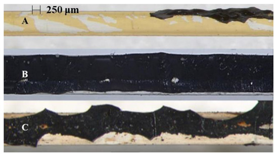 The plasma parameters that gave the best adhesive coating were used to treat the PET monofilament which is the target material. Low Pressure Plasma (LPP) treatment (W = 175, d.c. = 50%, t.t = 20 min, Ø2-iox = 3.3 sccm; ØAr = 2.3 mln/min) was performed on the PET monofilament (diameter 0.40 mm), and the sample was vulcanized with a rubber sheet. The PPOL adhesion was tested by the CRA (Cord Rubber Adhesion) test, which measures the extraction force, while the degree of coverage was evaluated by optical microscopy. The extraction force and the coverage degree of PET were improved after the plasma treatment; nevertheless, the PPOL looked scraped, and the coating was not well stabilized on the PET monofilament (Figure 5). To improve the stability between the plasma coating and the PET monofilament, and therefore the adhesion with the rubber, a plasma activation was performed on the samples before the PE-CVD with 2-iox. The plasma activation was made before the PE-CVD, in the same reactor, using Argon in the continuous regime for 120 s (100 W). This plasma process, performed using an inert gas, makes it possible to create radical species on the surface, which make the material more reactive [21]. The PPOLs’ extraction force and the degree of coverage were then compared with the adhesion results obtained on PET mono treated with epoxy bath + RFL (classical treatment). For each PPOL or RFL dip, three samples were prepared to evaluate the adhesion. The values collected in Table 6 are the averages of three measurements. The images collected by the optical microscopy (Figure 5) show the success of the activation; the back residual represents the part of the rubber that remained on the monofilament after the CRA test, the residual increases with the pre-activations. It was possible to observe that the residual of rubber completely covered the monofilament (pre-activated with Argon Plasma) after the CRA test. Moreover, the extraction force of the activated PPOL was comparable (slightly lower) with the reference (PET + epoxy +RFL). In conclusion, the degree of coverage was higher for the plasma-treated cord.
