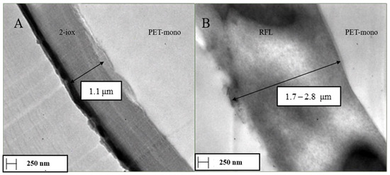 TEM images were collected (Figure 6) for further examination of the two adhesives, the 2-iox PPOL and the RFL. The two adhesives differ in terms of the thickness and uniformity of the covering; in fact, the measure of the height of the PPOL gave a constant value (1.1 µm) and the height of the RFL dip was included in a range between 1.7 and 2.8 µm.