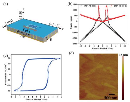 (a) Schematic diagram of strain measurement for the FePt/PMN-PT/Au under applied electric fields; (b) the electric field dependence of in-plane strain curves along the [100] and [01−1] directions, respectively; (c) the polarization hysteresis loop of the FePt/PMN-PT/Au at room temperature; (d) the surface morphology image of the FePt film with an area of 2 × 2 um2.